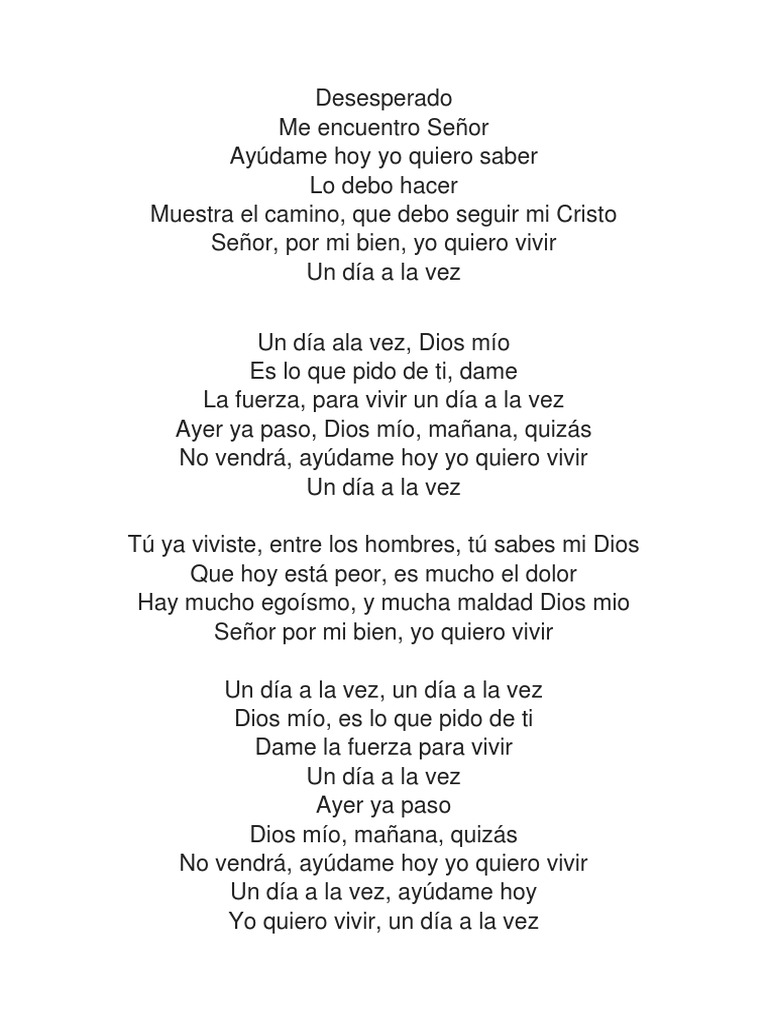 Un Dia A La Vez Letra / Necesitado, me encuentro senor ayudame a ver yo quiero saber,lo debo hacer muestra el camino, que debo seguir senor, por mi bien, yo quiero vivir un dia a la vez un dia ala vez, dios mio es lo que pido de ti,dame la fuerza, para vivir.